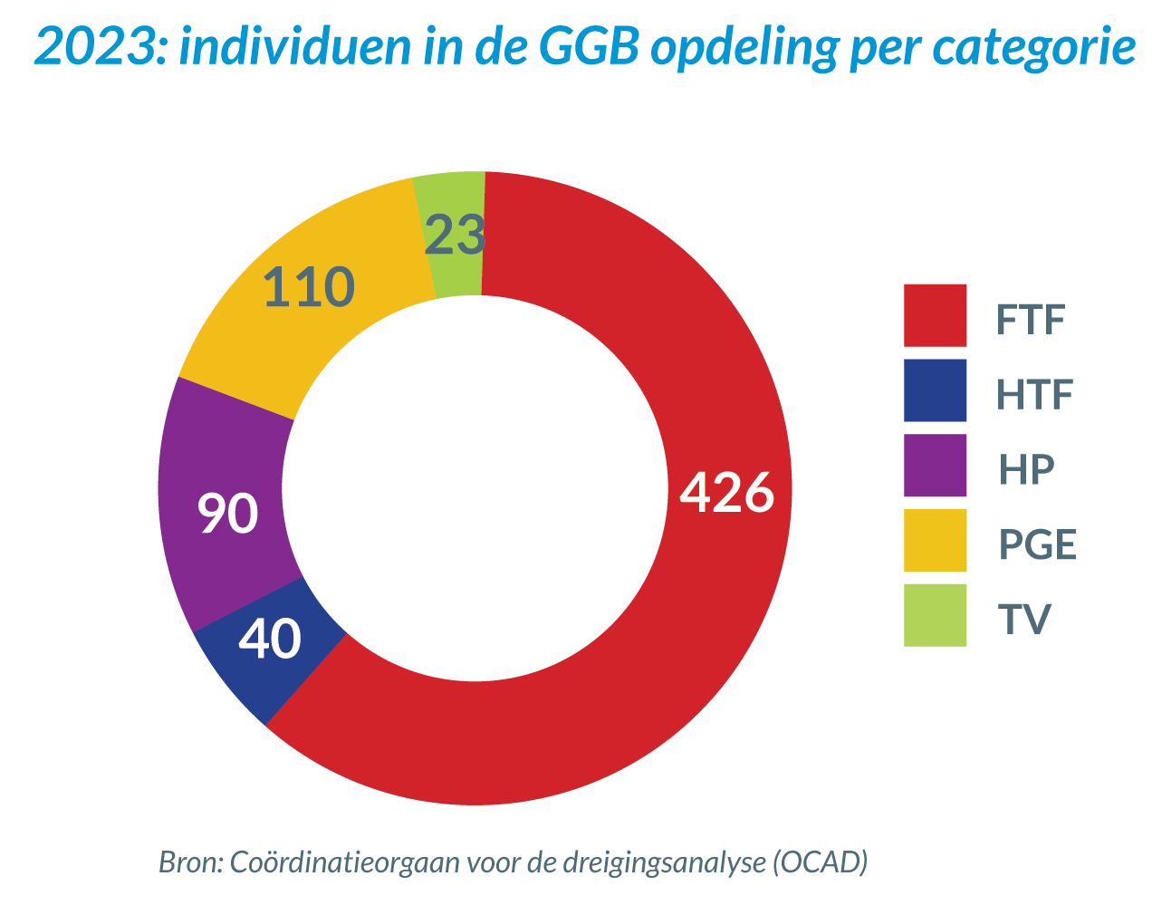- 426 Foreign Terrorist Fighters (FTF’s): personen die naar een conflictgebied zijn vertrokken om er een terreurgroep te vervoegen of hiervan terugkeerden, of waarbij het vertrek is verhinderd of die de intentie hebben om dit te doen;