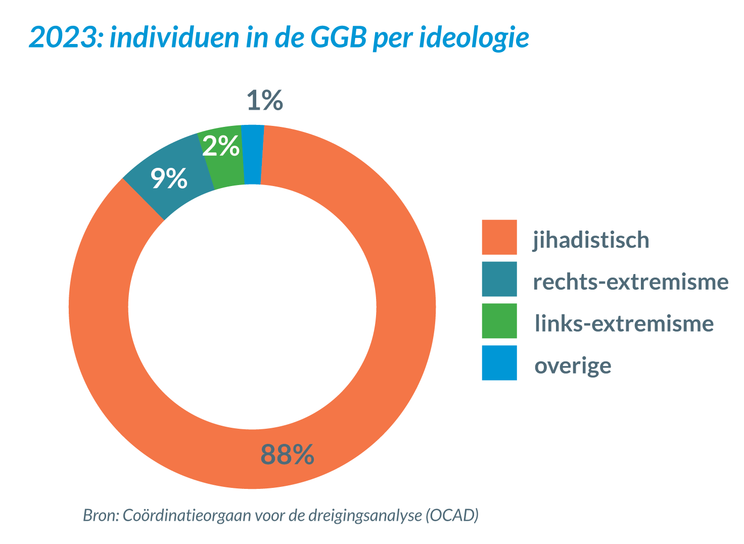 88% van de individuen komt uit de hoek van een jihadistische ideologie. 9% van de individuen houden verband met rechts-extremisme. 2% van de individuen situeren zich binnen het links-extremisme. De overige personen worden opgevolgd in het kader diverse dreigingen die voorkomen uit een specifieke thematiek in de samenleving zoals anti-establishment gevoelens of een politieke context in het buitenland.